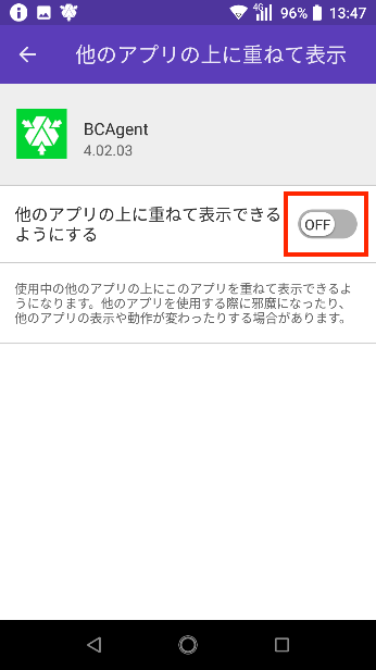 9.「他のアプリケーションの上に重ねて表示できるようにする」を「ON」にし、「戻る」をタップします。