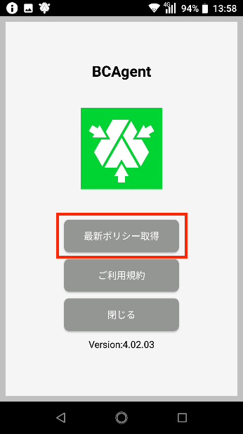 12.BCAgentを起動し、「最新ポリシー取得」をタップします。