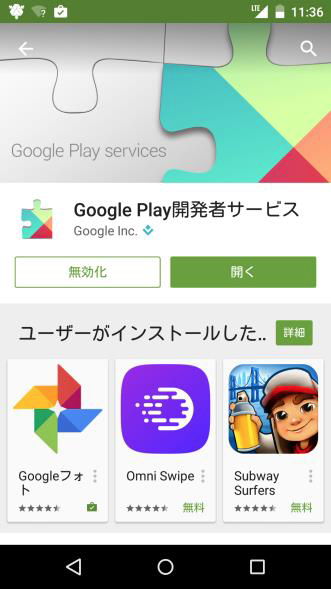 | 「Play開発者サービスの更新」画面が一瞬表示されますが、操作する必要はありません。「更新」をタップした場合は、背景の画面が変わりますが、そのまま次の操作に進んでください。 |