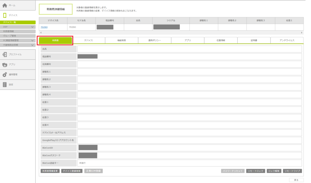 ・紛失時リカバリーサービスを利用している場合は、パスワードリセット、リモートロック、ロック解除、外部メモリ消去、リモートワイプが実行できます。