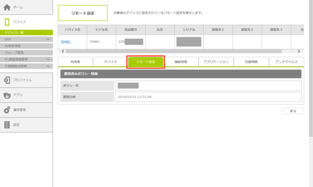 デバイスに適用されているリモート設定のポリシー名および適用時間が表示されます。