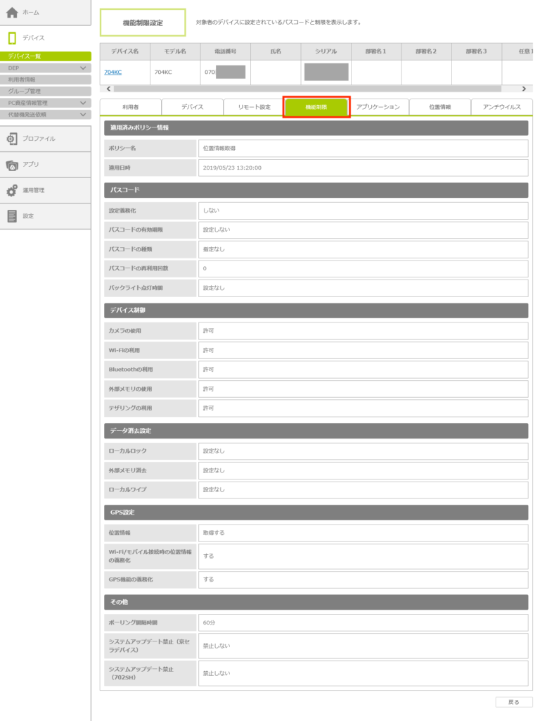 機能制限 デバイスに適用されているポリシーの設定内容が表示されます。 機能制限設定情報
