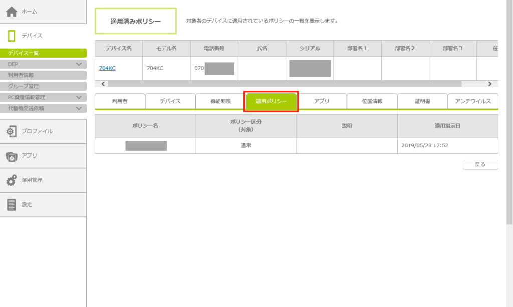 リモート設定 デバイスに適用されているリモート設定のポリシー名および適用時間が表示されます。 リモート設定情報(レガシーMDMの場合)