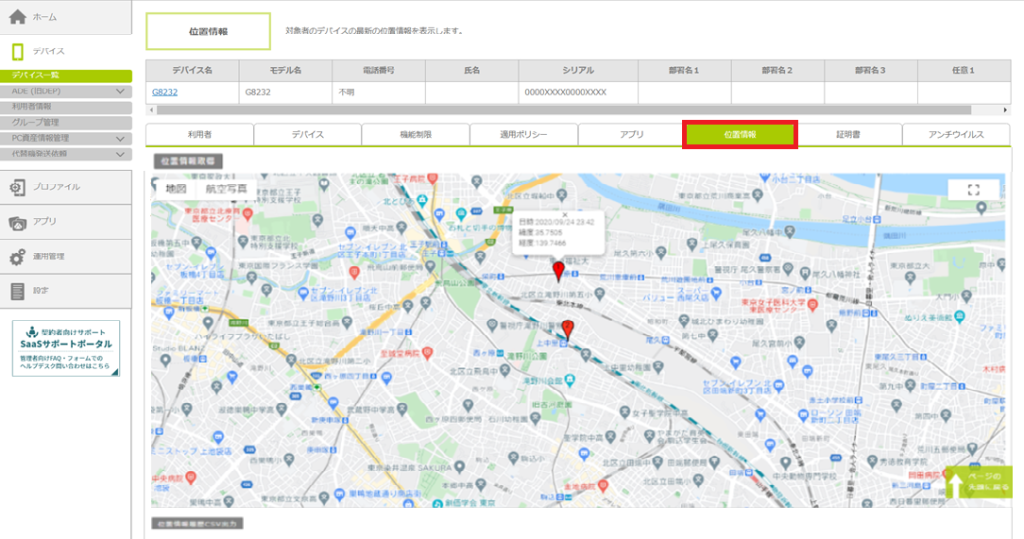 ・位置情報を取得するには、位置情報を取得するためのポリシーをデバイスに適用しておく必要があります。ポリシーの詳細は「4.6. デバイスに適用するポリシーを管理する」を参照してください。