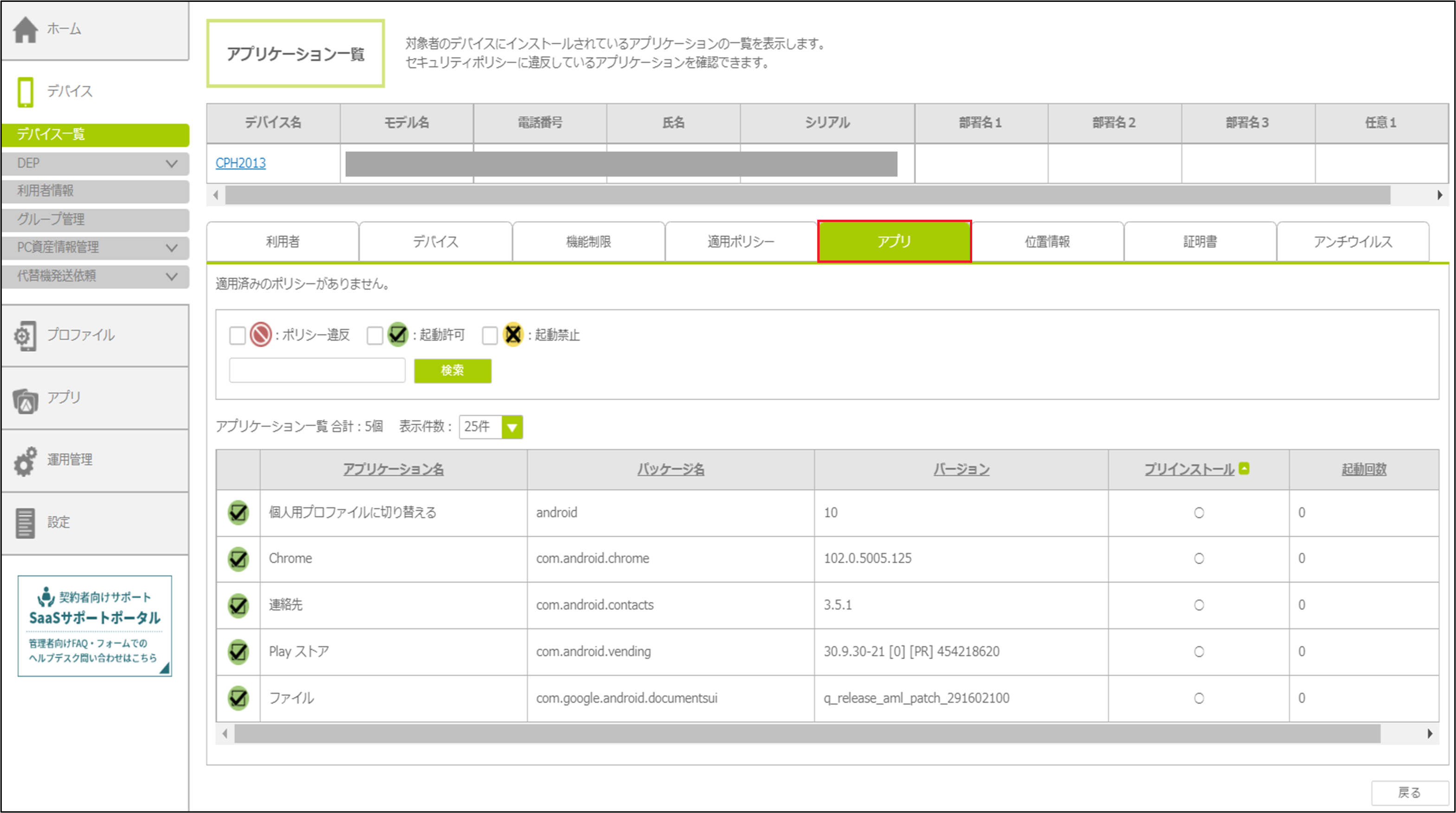 ・ステータスが「ポリシー違反」となっているアプリケーションを、管理者が遠隔操作で削除することはできません。ただし、違反アプリケーションがポストインアプリの場合は、対象デバイスにアンインストール指示を行えます。