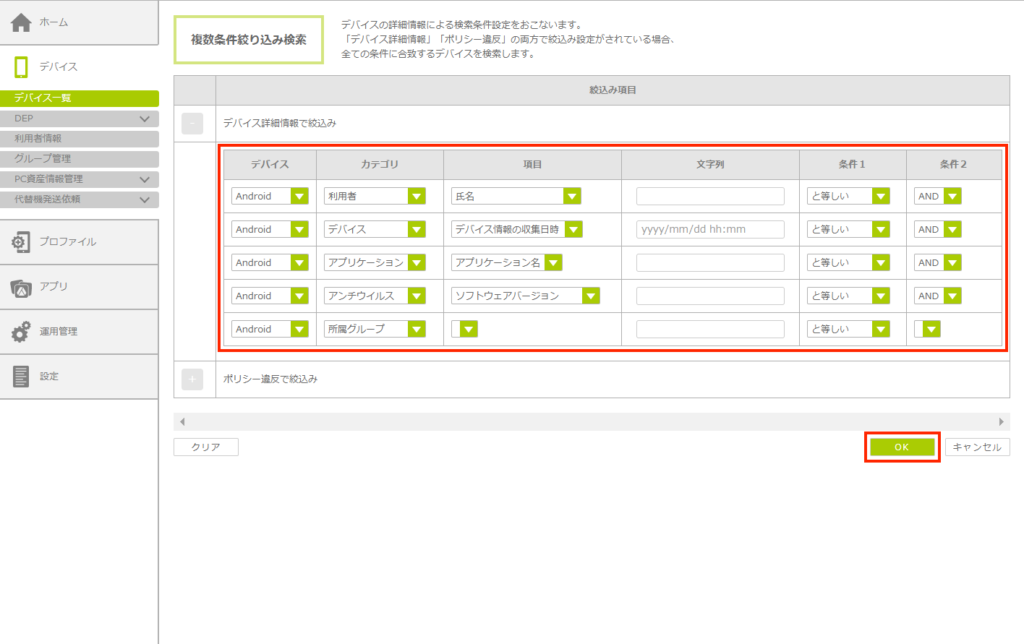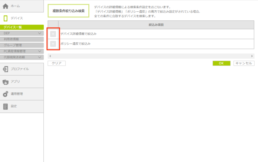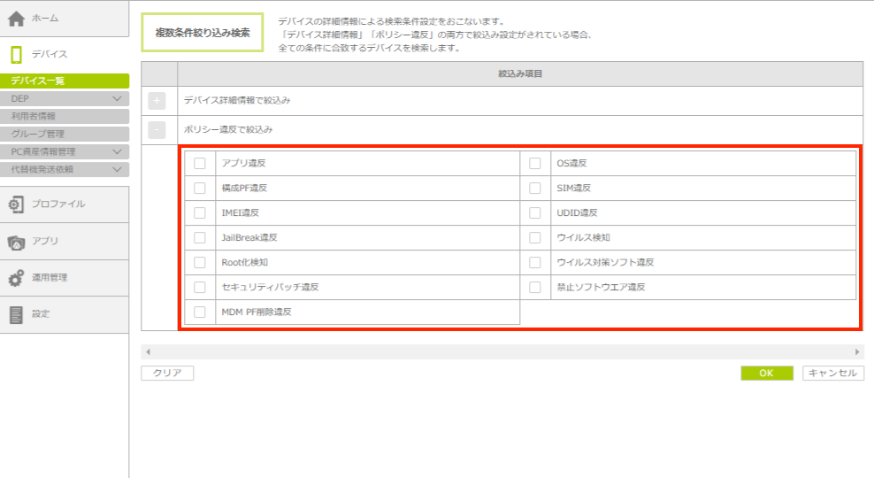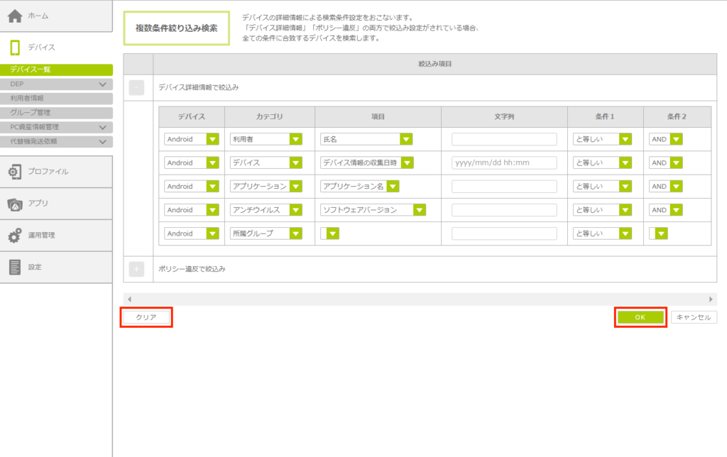 • デバイス詳細情報/ポリシー違反で検索した後に、再度「複数条件で絞込み」ボタンをクリックし、「クリア」ボタン、「OK」ボタンの順にクリックする。
