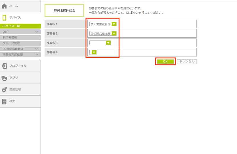 利用者の部署名を指定して、表示されるデバイスを絞り込むことができます。