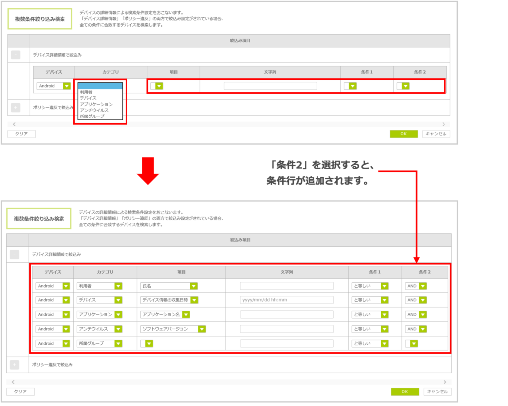「条件2」で「AND」または「OR」を選択すると、次の条件が入力できるようになります。