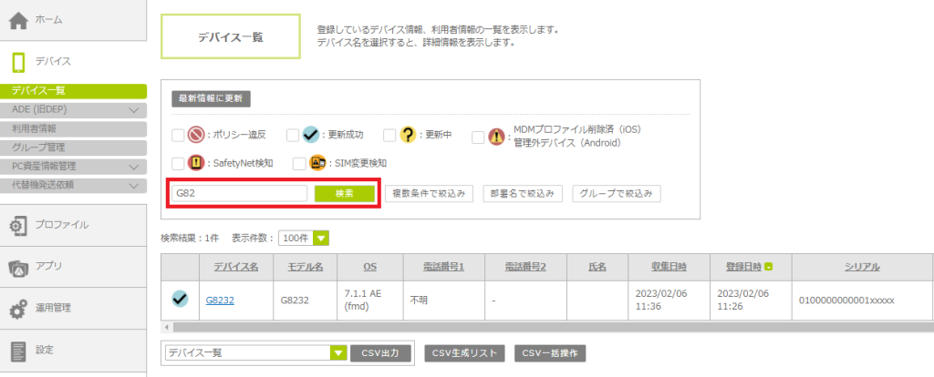 • 部署名/グループ、デバイス詳細情報/ポリシー違反で検索した後に、「デバイス一覧」をクリックする。