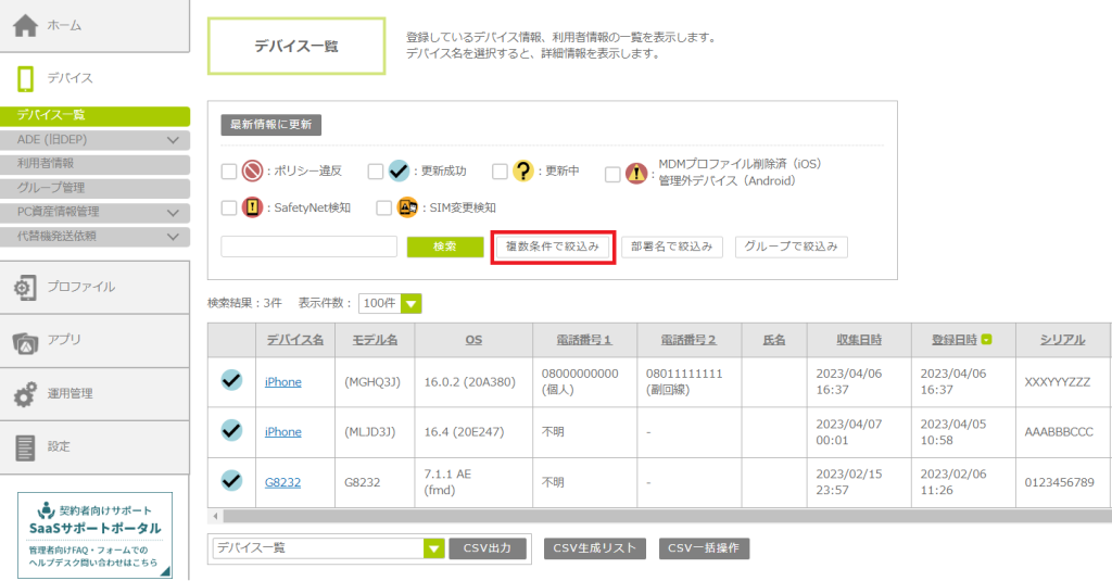 ・「デバイス詳細情報で絞込み」と「ポリシー違反で絞込み」の両方に検索条件を設定した場合は、どちらの条件にも合うデバイスが表示されます。