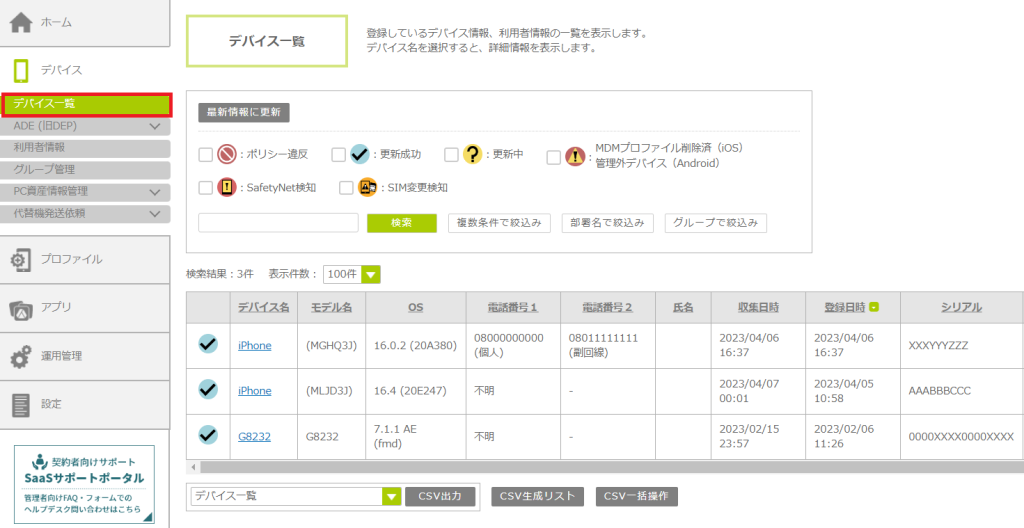 ・デバイス情報:デバイス名、モデル名、OS、シリアル番号、電話番号1、電話番号2、IMEI(識別番号)