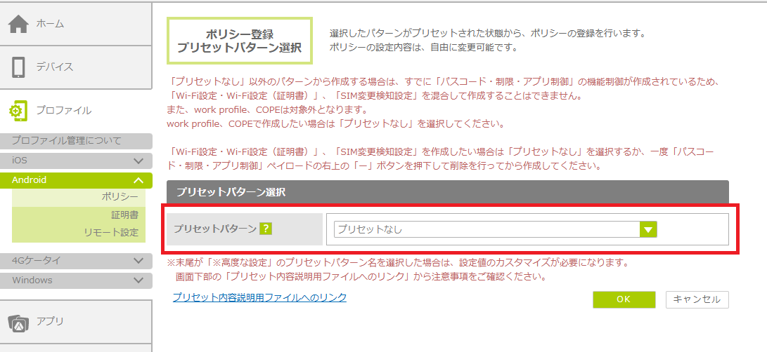「ポリシー登録 プリセットパターン」画面が表示されます。