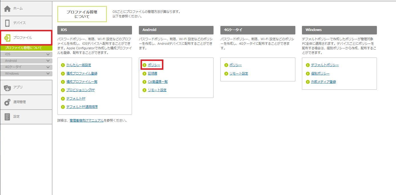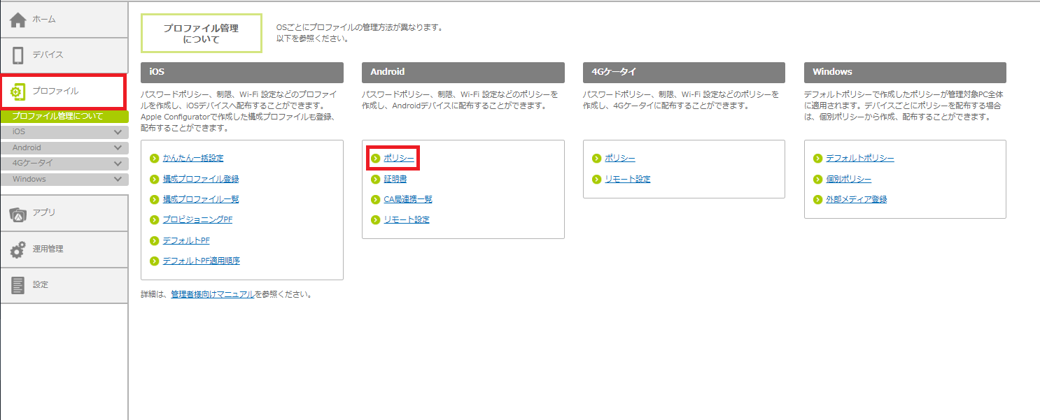 1.「プロファイル」をクリックし、「Android」の「ポリシー」をクリックします。