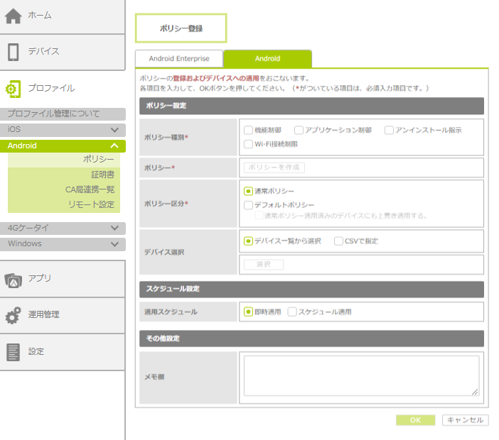 | M7から始まる環境の場合はAEを利用できないため、「ポリシー登録」画面などの各画面に「Android」タブおよび「Android Enterprise」タブは表示されません。 |