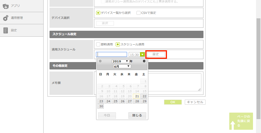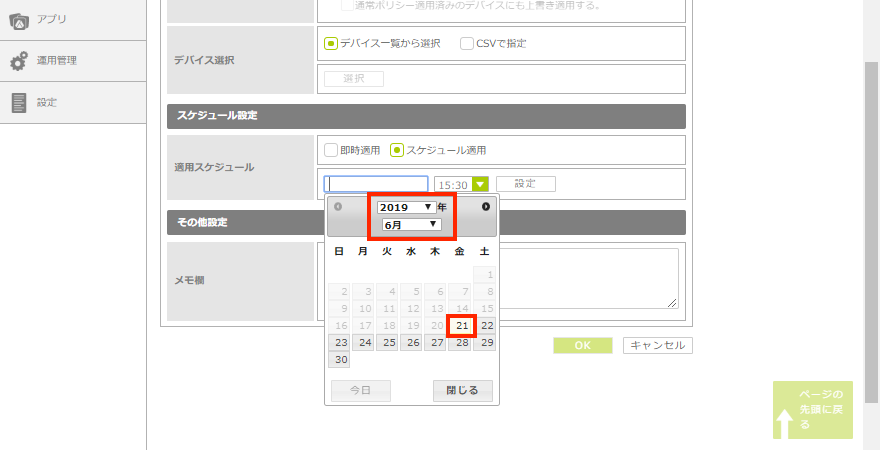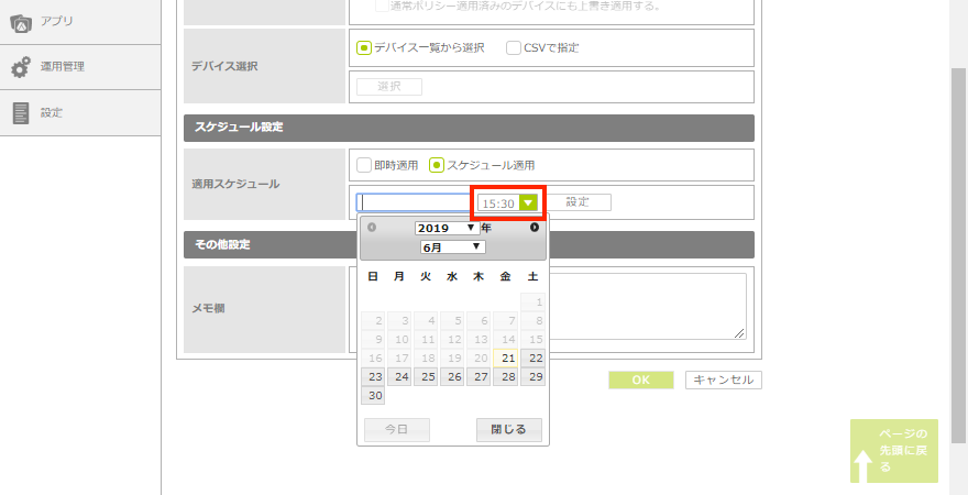 | スケジュール(配信日と時間)を設定しないと、「即時適用」となり、すぐにポリシーが配信されます。 |