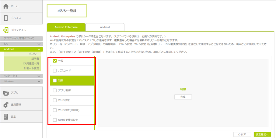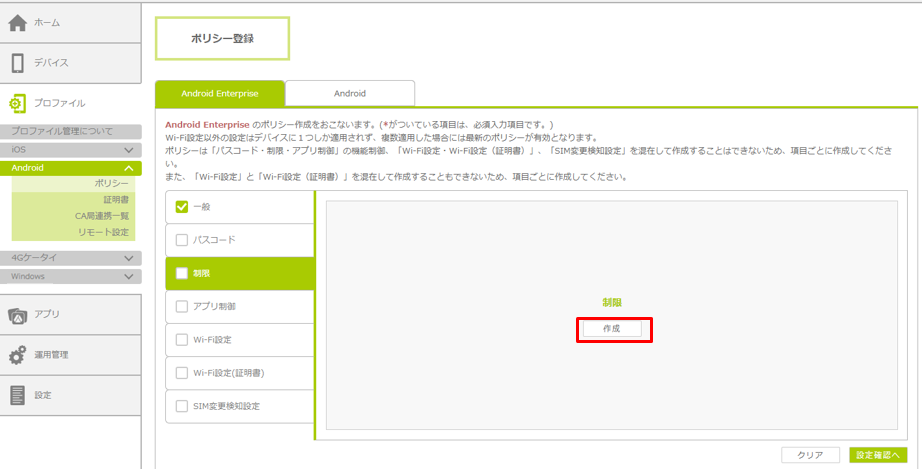 6.必要に応じて、「パスコード」、「制限」、「アプリ制御」、「Wi-Fi設定」、「Wi-Fi設定(証明書)」「SIM変更検知設定」の項目で、必要な情報を設定します。