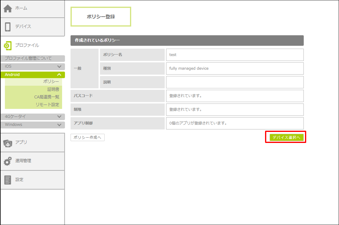 作成したポリシーが登録され、デバイスに適用されます。
