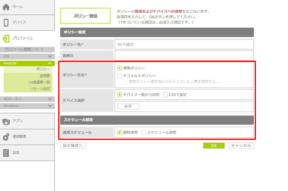 | 通常ポリシー | デバイス単位でポリシーを配信し、適用します。 | 「4.6.4. ポリシー区分(適用対象)を設定する」>「「通常ポリシー」を選択した場合のデバイス指定方法」 |