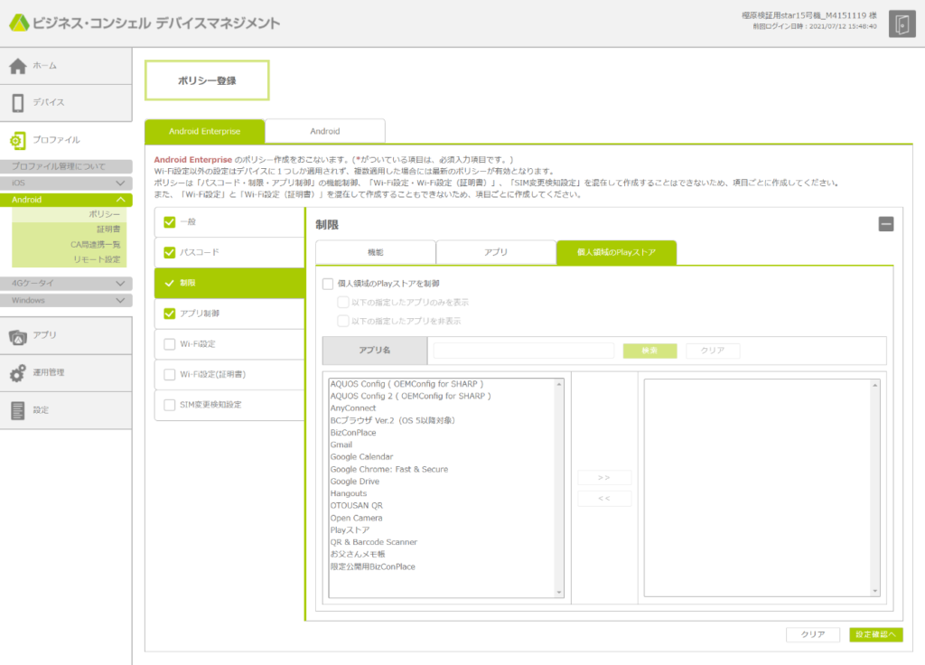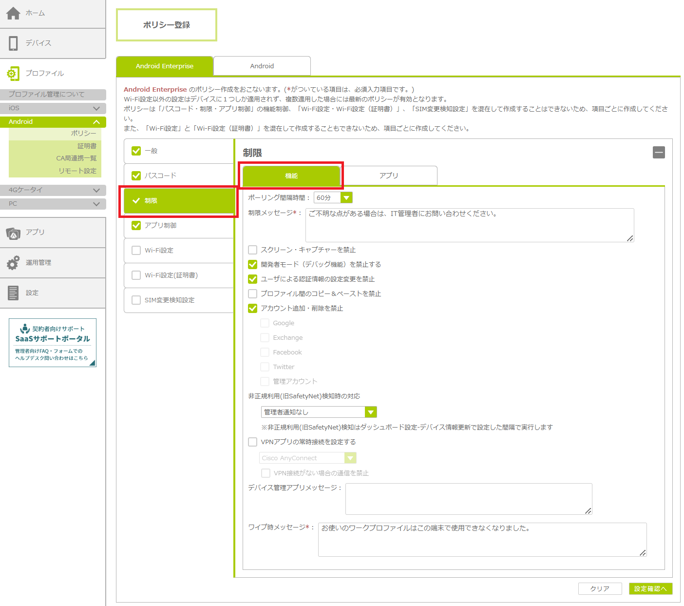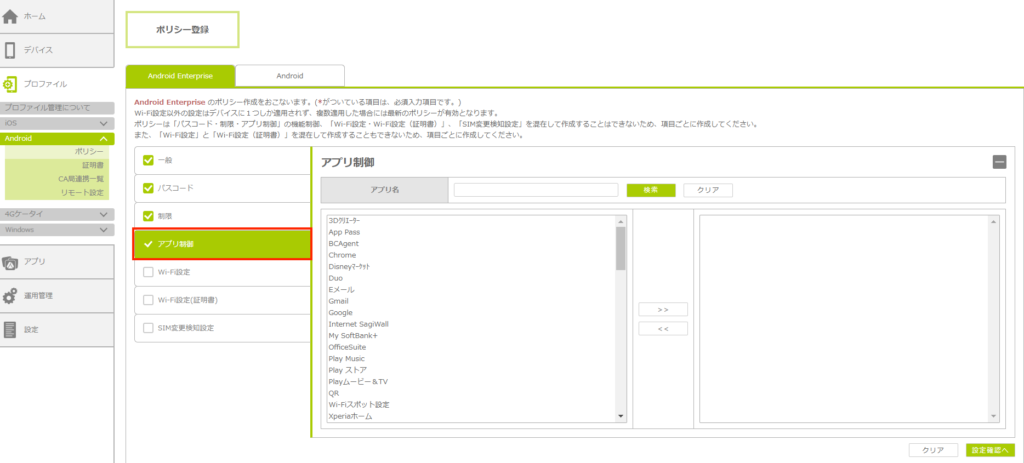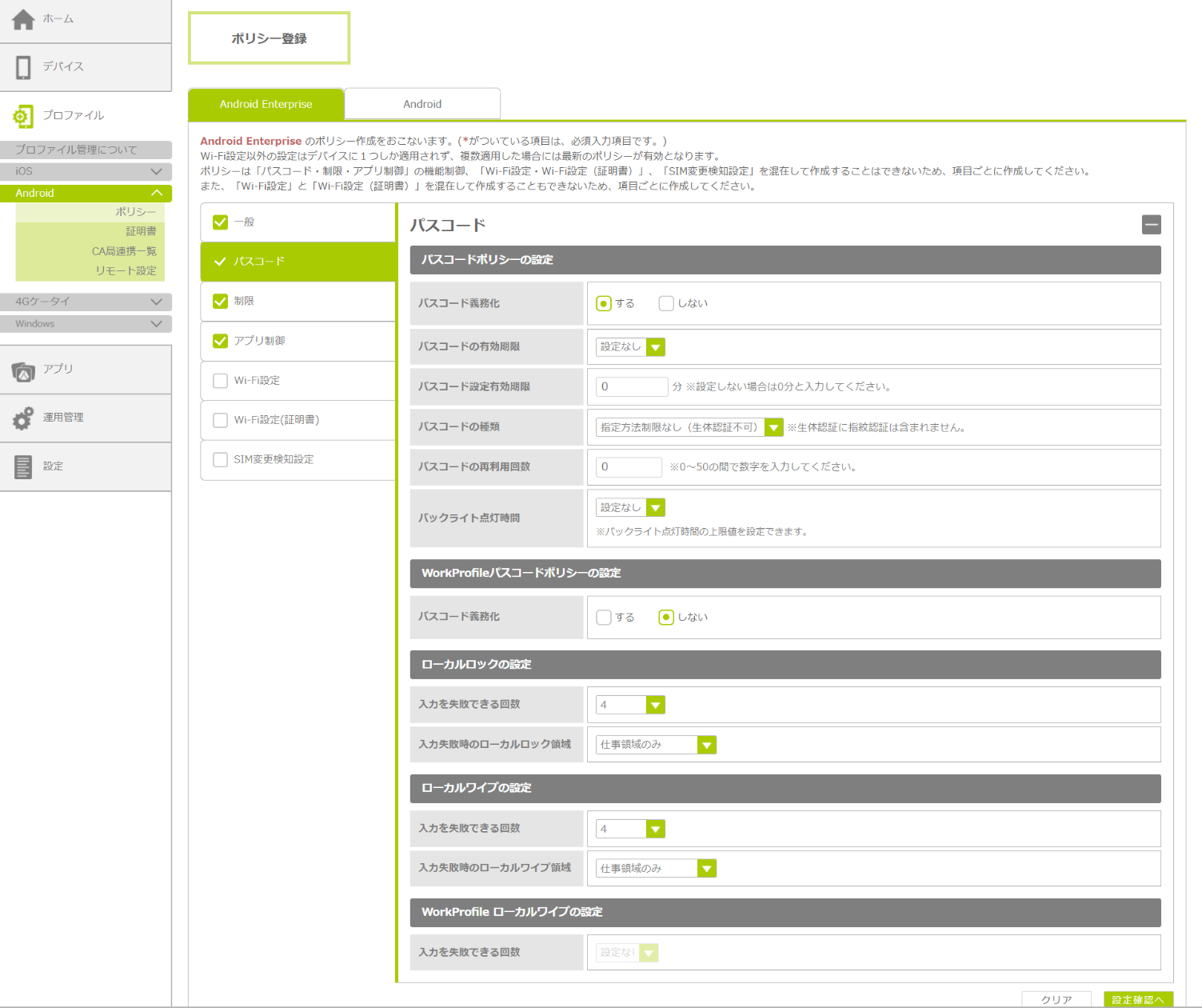 - 「パスコード」、「制限」、「アプリ制御」のいずれかの項目を設定した場合、「Wi-Fi設定」「SIM変更検知」の項目は選択できません。