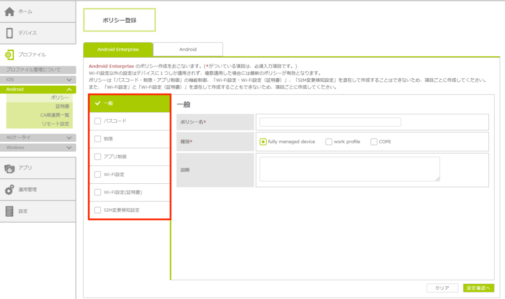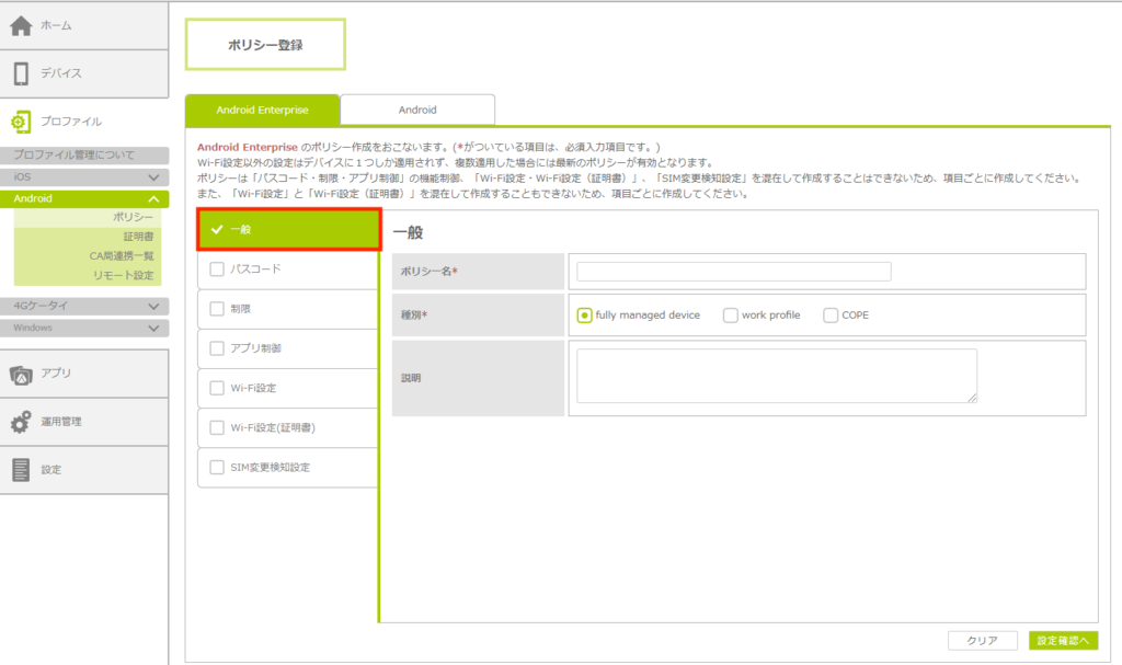 | 種別 | ポリシーを作成するAndroid Enterpriseのモードを選択します。 |
