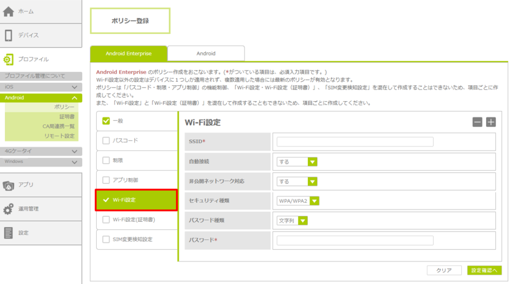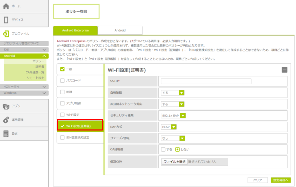 - 「Wi-Fi 設定・Wi-Fi 設定(証明書)」、「SIM 変更検知設定」を作成したい場合