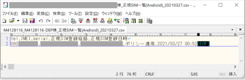 ・CSVファイル内に記入したデバイスをSIM変更検知設定ポリシーの対象デバイスに指定してください。ポリシーの対象デバイスに指定しない場合、正規SIM登録されません。尚、ポリシー作成時適用されていないデバイスは、再度適用頂くと正規SIM登録されます。 ・IMEI,Serial はCSVファイル内で重複しないように記入してください。電話番号は重複して記入頂けます。 ・CSVファイルの文字コードは、管理サイトで設定されている言語によって異なります。日本語の場合はShift-JIS、英語の場合はUTF-8(BOM無し)を使用してください。これ以外の文字コードを使用したい場合は、予期せぬ挙動が発生する可能性がございます。CSVファイルの作成手順は「1.4.3. CSVファイルを作成する」を参照してください。 ・DMコードがM6から始まる環境で、電話番号を使用してCSVファイルで指定する場合は、デバイス一覧画面に表示される「電話番号1」列の電話番号を使用してください。 |