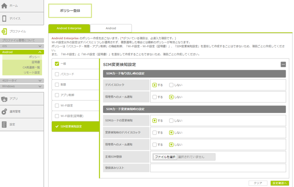 SIMカードの変更を検知するポリシーを作成します。ポリシーの設定に応じた処理を実施できます。