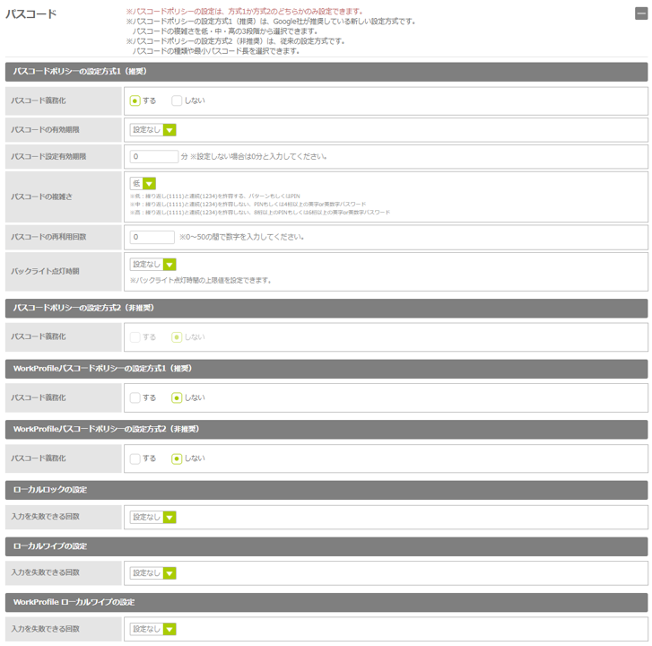 パスコードポリシーの設定は、方式1か方式2のどちらかのみ設定できます。 ・パスコードポリシーの設定方式1(推奨)は、Google社が推奨している新しい設定方式です。 ・パスコードポリシーの設定方式2(非推奨)は、従来の設定方式です。 ・方式1か方式2のどちらかの「パスコード義務化」で「する」が選択されている間は、もう片方の項目は編集できません。もう片方の方式を編集する場合は、現在有効になっている方式の「パスコード義務化」を「しない」に切り替えてください。 |