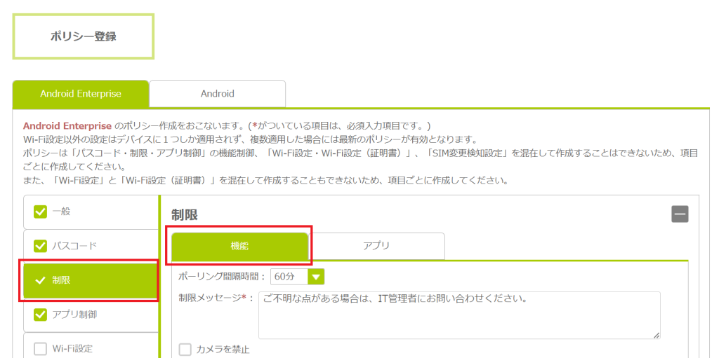 ここでは、Android Enterpriseを利用する場合に、「ポリシー登録 プリセットパターン選択」画面でプリセットパターンの内容を設定する方法と、「ポリシー登録」画面でポリシーの内容を設定する方法を説明します。