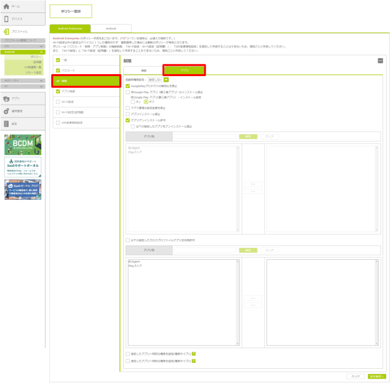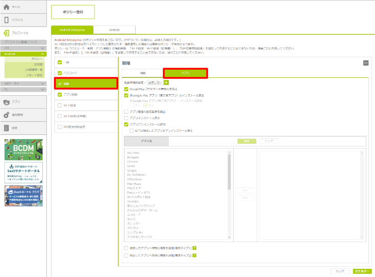 - 「パスコード」、「制限」、「アプリ制御」のいずれかの項目を設定した場合、「Wi-Fi設定」「SIM変更検知」の項目は選択できません。