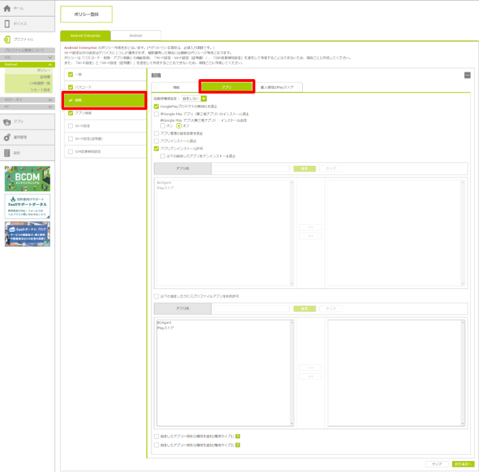ここでは、Android Enterpriseを利用する場合に、「ポリシー登録 プリセットパターン選択」画面でプリセットパターンの内容を設定する方法と、「ポリシー登録」画面でポリシーの内容を設定する方法を説明します。