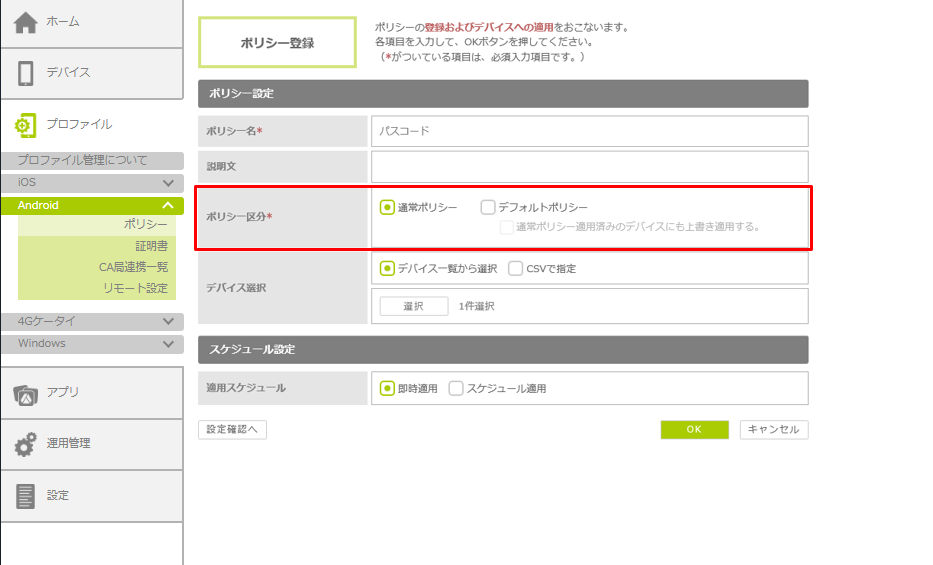 ・「通常ポリシー適用済みのデバイスにも上書き適用する。」にチェックを入れると、通常ポリシーを適用したデバイスにポリシーを上書きできます。