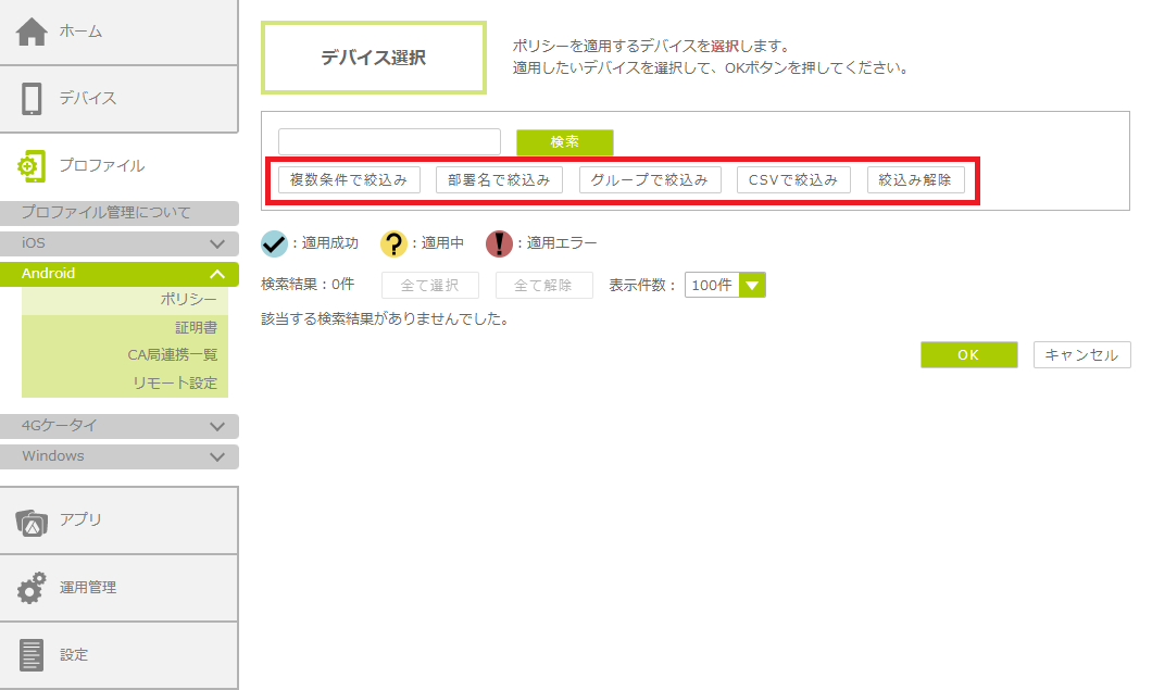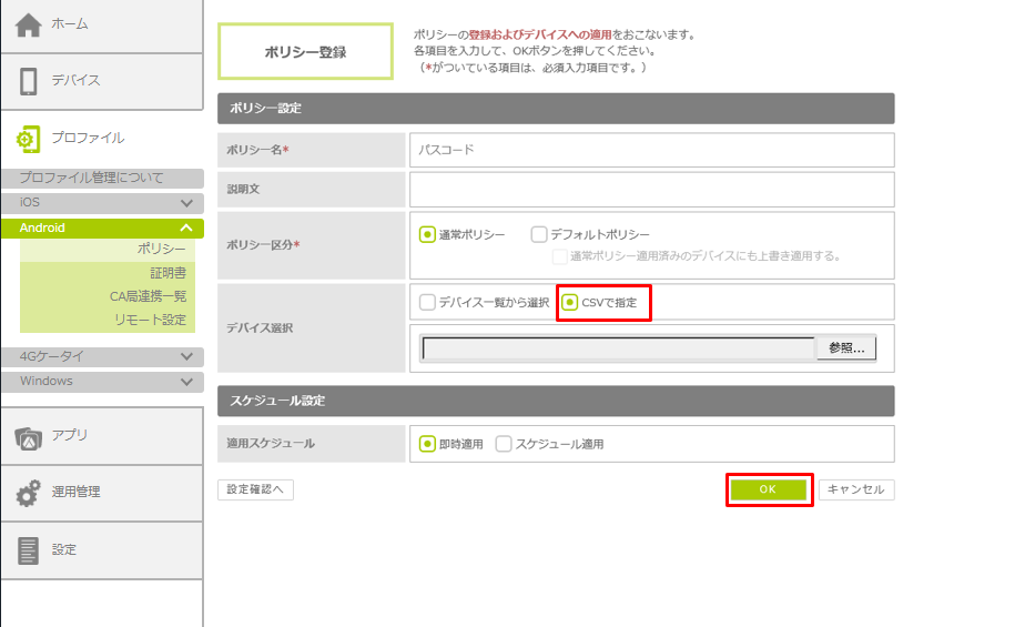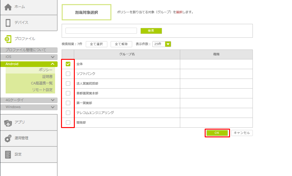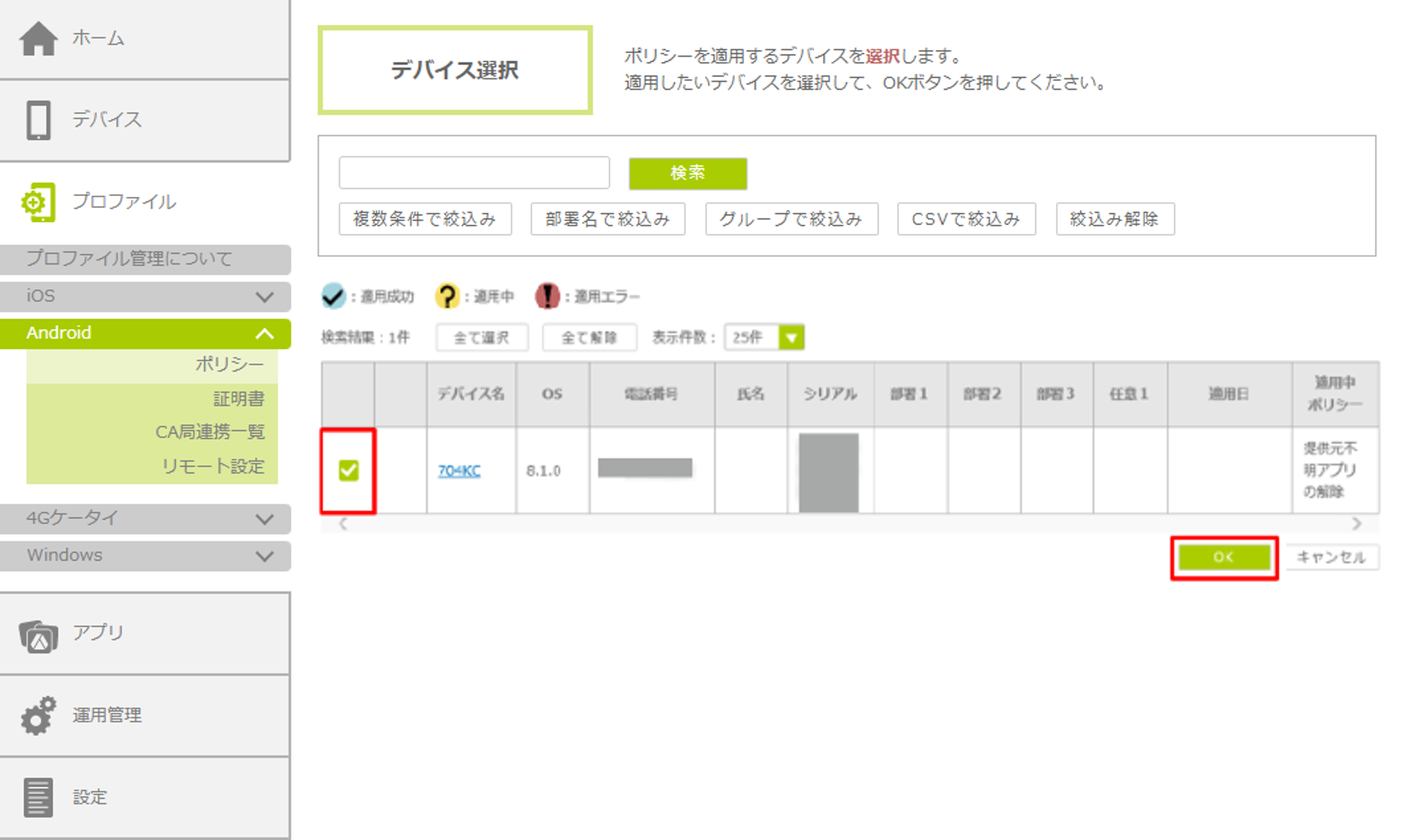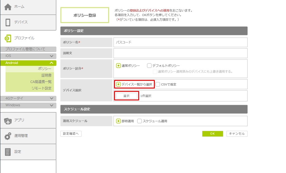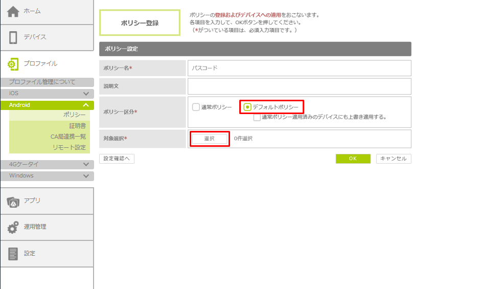 3.ポリシーの適用対象デバイスにチェックを入れ、「OK」ボタンをクリックします。