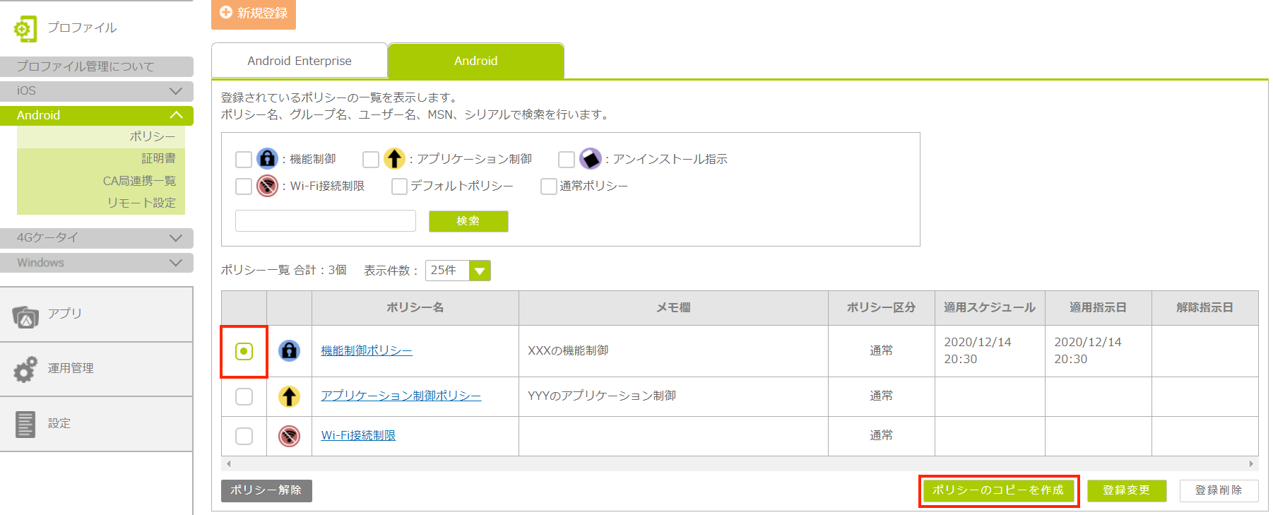| デバイス選択と適用スケジュールは、コピー元のポリシーから設定は引き継がれません。コピー先のポリシーをデバイスに配布するには、新たに設定を行う必要があります。 |
