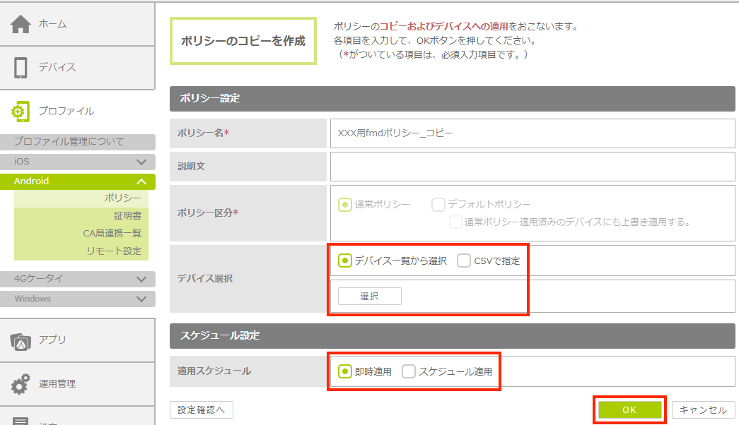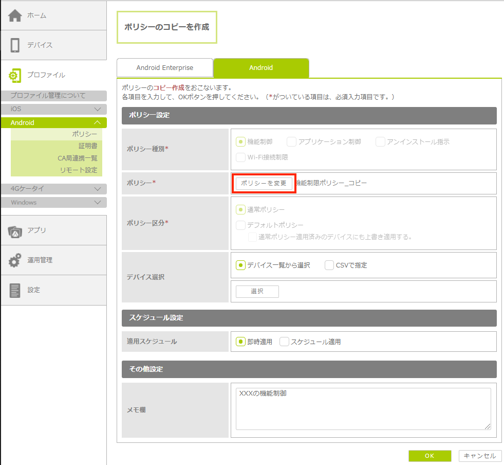 | ・デバイス選択と適用スケジュールは、コピー元のポリシーから設定は引き継がれません。コピー先のポリシーをデバイスに配布するには、新たに設定を行う必要があります。