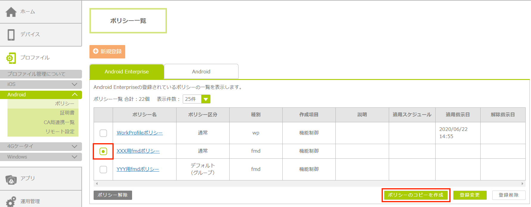 1.「プロファイル」をクリックし、「Android」の「ポリシー」をクリックします。