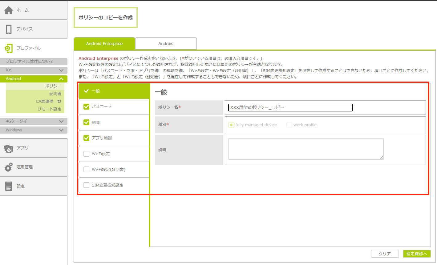 ポリシー種別はコピー元ポリシーの設定が引き継がれ、変更することはできません。ポリシー種別が異なるポリシーを作成する場合は、新規登録を行います。