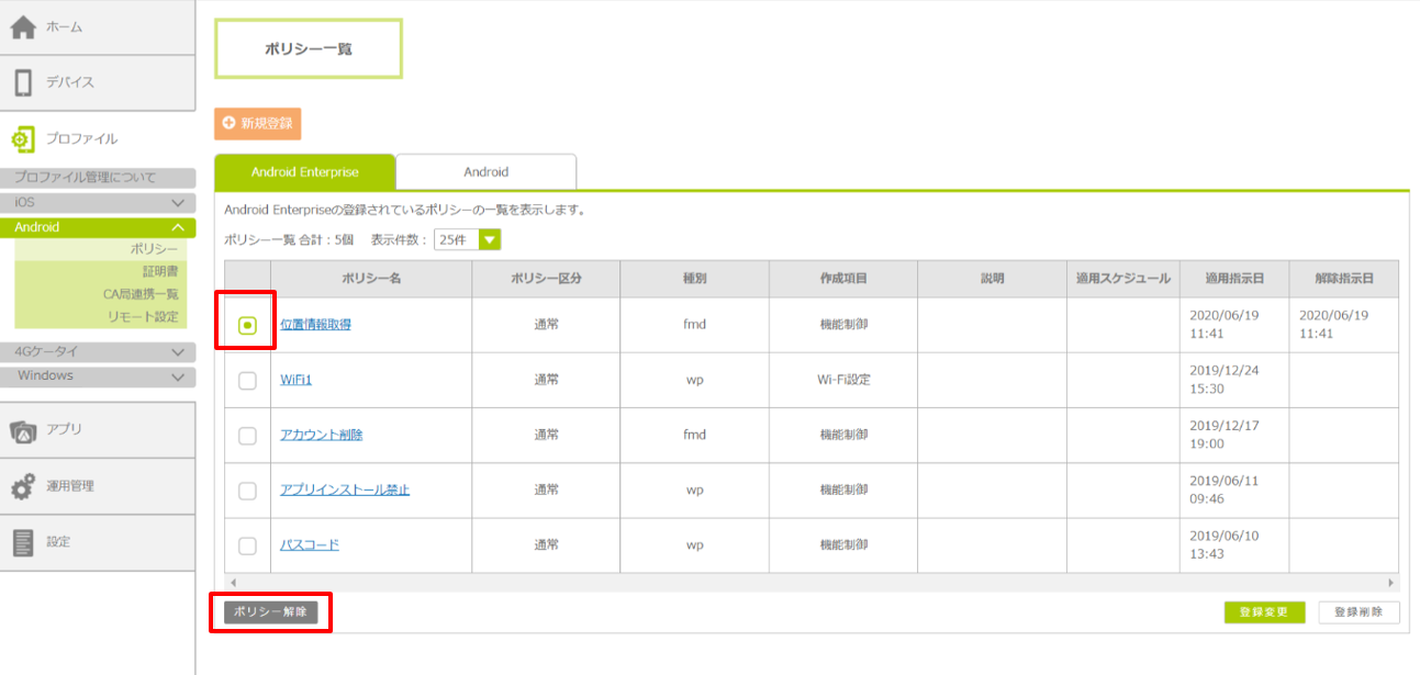 ここでは、不要になったポリシーをデバイスから解除する方法と、管理サイトから削除する方法を説明します。