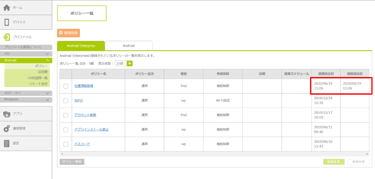 1.「ポリシー一覧」画面で、該当ポリシーの「適用指示日」および「解除指示日」に、ポリシーを解除した日時が表示されていることを確認します。