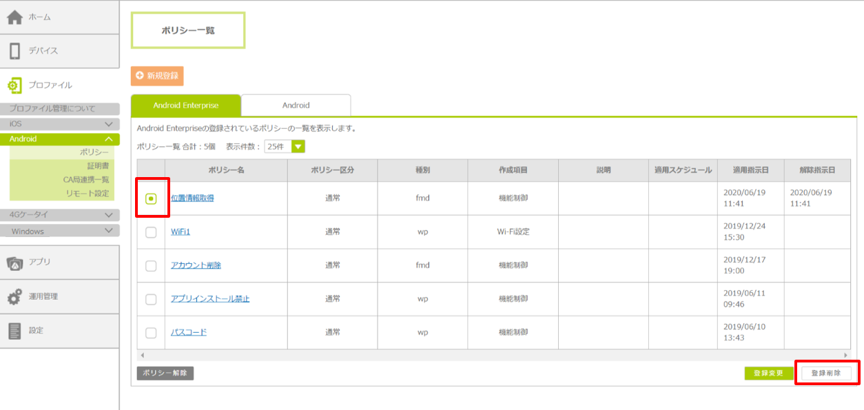 3.削除したいポリシーを選択し、「登録削除」ボタンをクリックします。