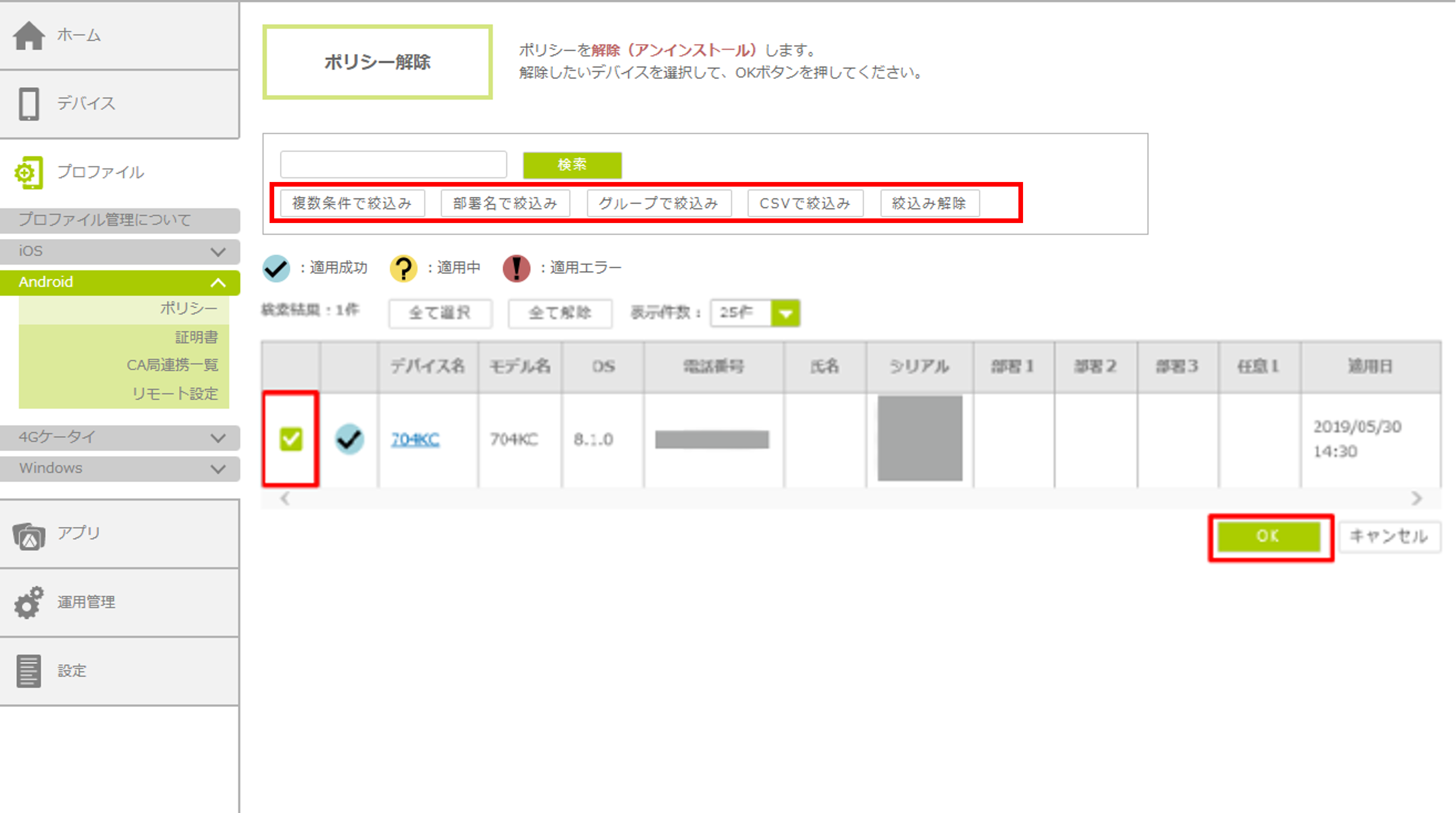 4.ポリシーを解除したいデバイスにチェックを入れ、「OK」ボタンをクリックします。