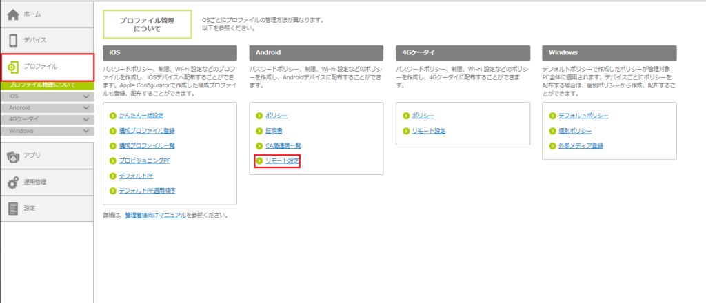 1.「プロファイル」をクリックし、「Android」の「リモート設定」をクリックします。