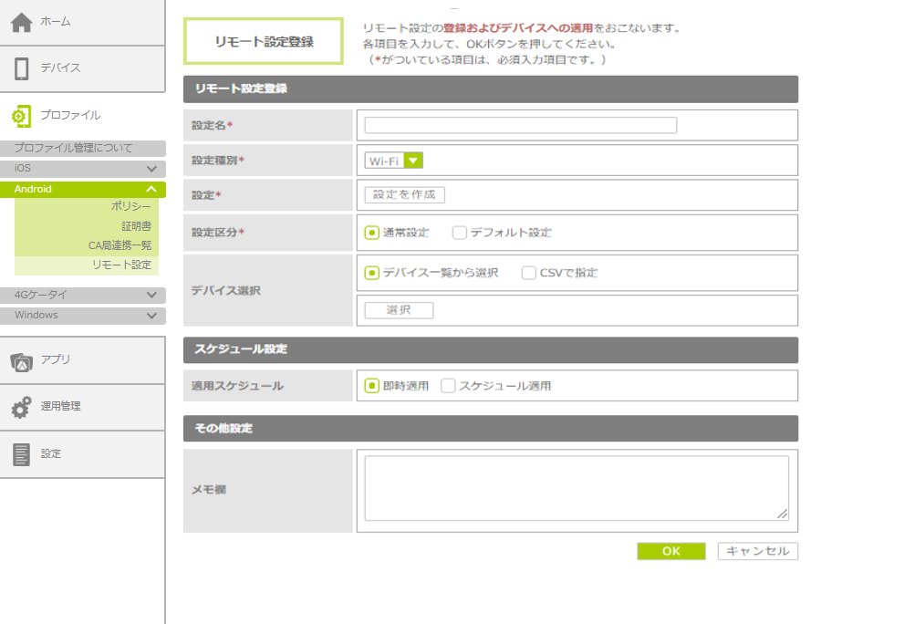 リモート設定を管理サイトに登録し、管理対象デバイスに適用します。機能制御などのポリシーと異なり、1台のデバイスに対して、複数のリモート設定を適用できます。