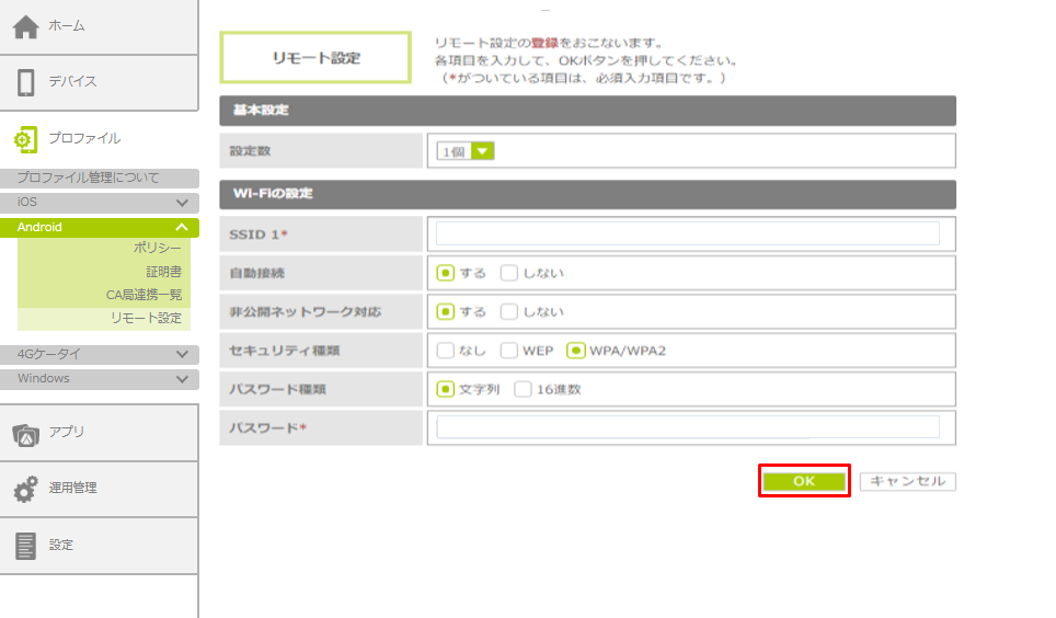 • Android OS 6以降の場合、すでにデバイスに設定されている値と同じWi‐Fi設定をリモート設定で配信すると、管理サイト上のステータスがエラーとなる場合があります。