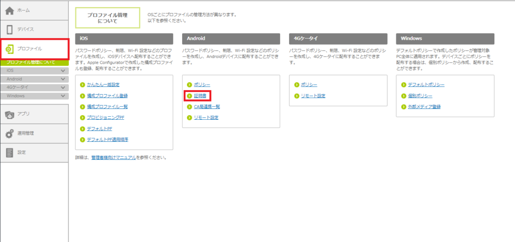 1.「プロファイル」をクリックし、「Android」の「証明書」をクリックします。