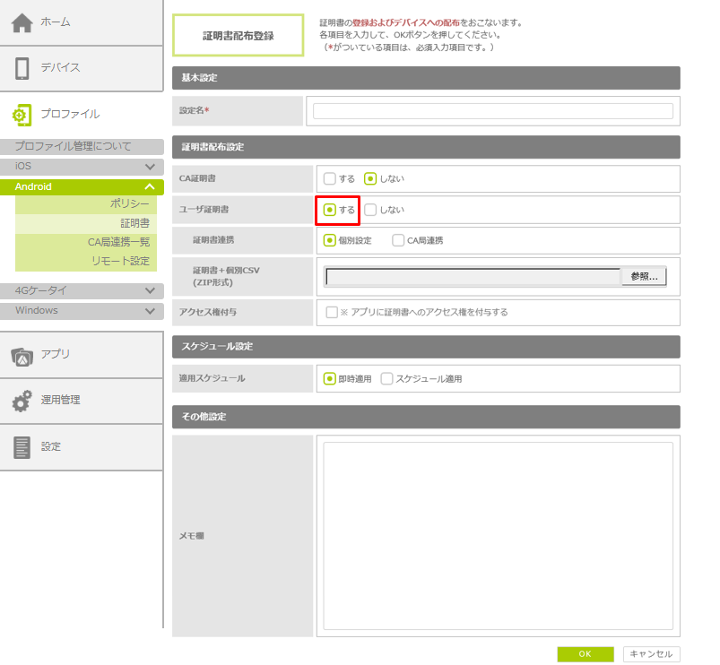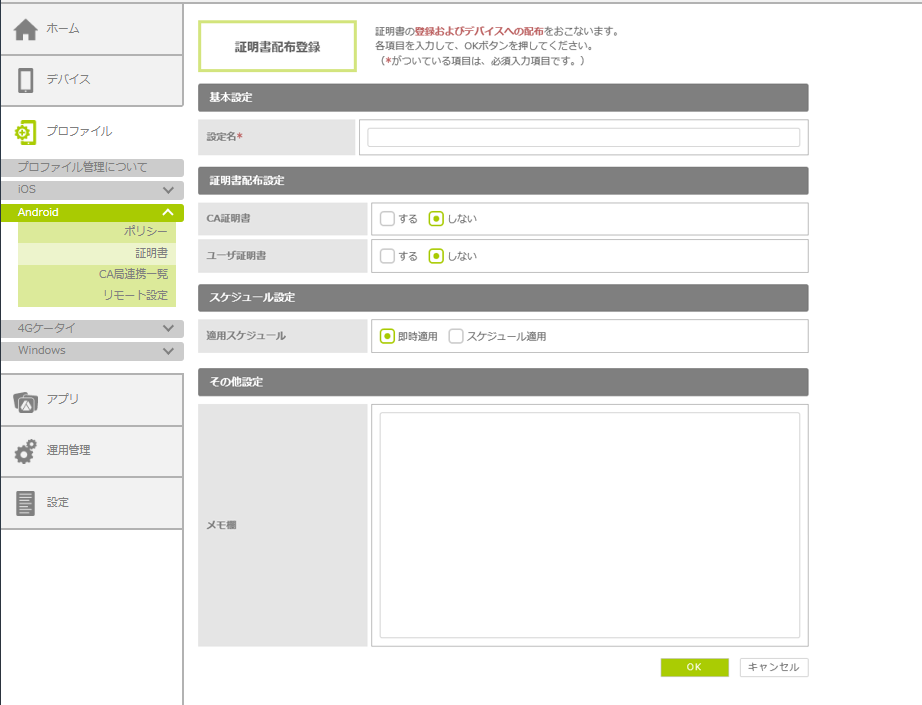 配布する証明書を管理サイトに登録し、デバイスに配布します。証明書の種類によって、登録時の設定項目が異なります。