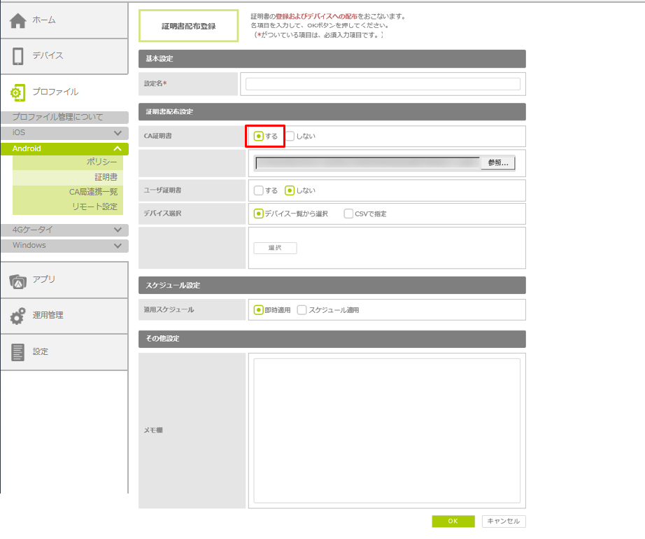 1.「証明書配布登録」画面を表示し、「CA証明書」で「する」を選択します。