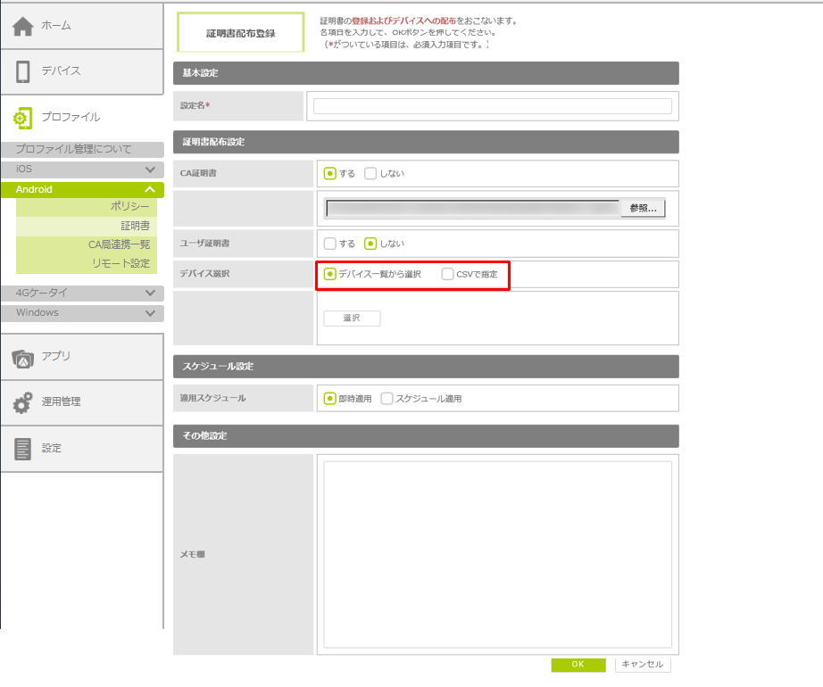 ・「する」を選択した場合は、デバイスの選択方法は「デバイス一覧から選択」または「CSVで指定」のどちらかとなります。ユーザ証明書の設定によって、デバイスの選択方法は変更されることがあります。