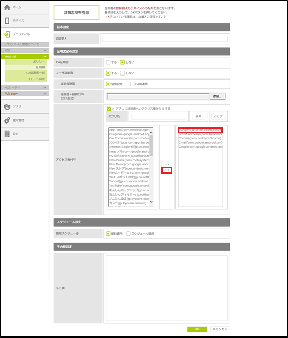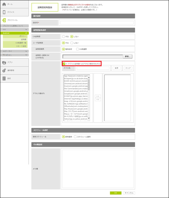 3.デバイスにインストールされているアプリケーションに対して、配布したユーザ証明書へのアクセス権を付与する場合は、「※アプリに証明書へのアクセス権を付与する」にチェックを入れます。