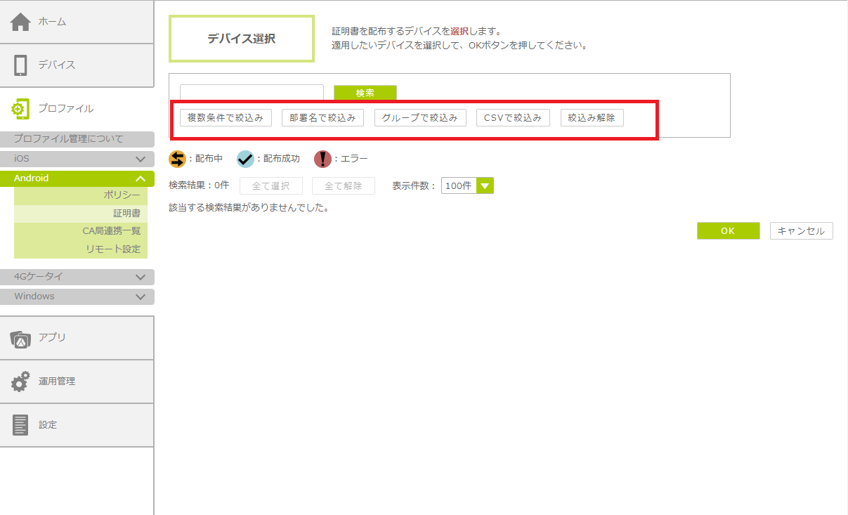 ・「複数条件で絞込み」、「部署名で絞込み」、「グループで絞込み」による検索方法は、「デバイス一覧」画面と同様です。4.5.4. デバイスを検索する